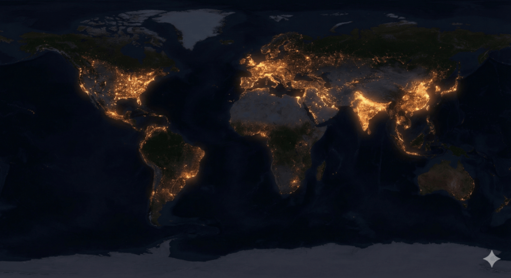 Read BriefingThese visualizations utilize open-source satellite telemetry and census data. By removing political borders, we reveal the true organic structure of civilization.